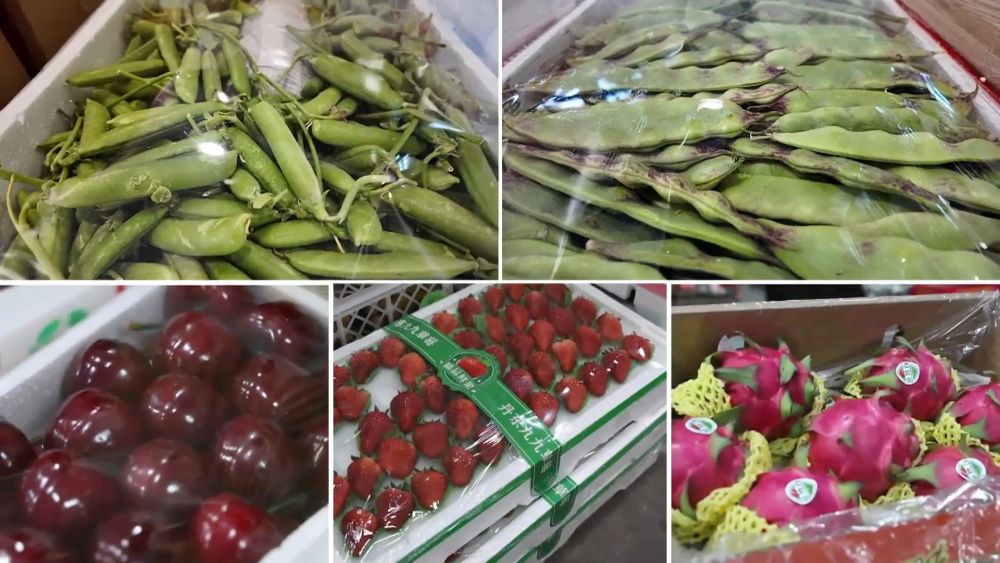 \n\t春节临近,位于辽宁省盘锦市的东北新发地农产品供应链中心,成了名副其实的年货中转站。每天,一车车的东北年货从这里发往全国,也有一车车的南方蔬果运抵这里。