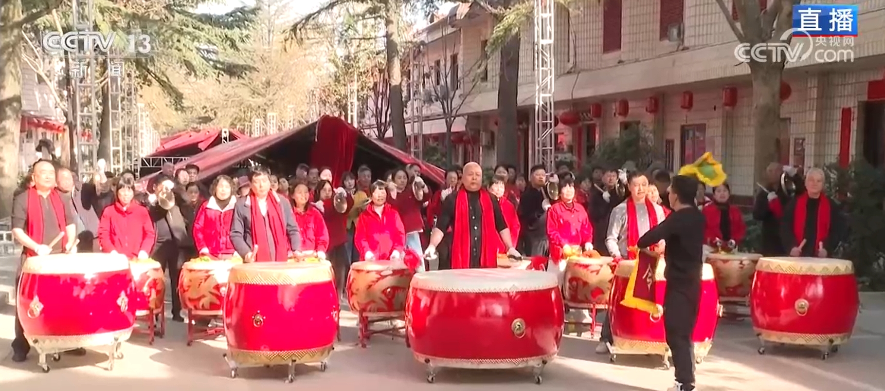 总台记者 张恩雨: \n 此刻,我是在袁家村的村口,同时也是村里百人锣鼓队表演的现场。在陕西关中农村地区,每年过年每个村子都会有这样的锣鼓表演,村民们告诉我,“锣鼓声一响,年就到了。” \n 大家可以看到,我身后的锣鼓队队员们是激情昂扬、气势如虹。这些铿锵有力的鼓点,正是关中地区非常有名的曲目《秦汉战鼓》,没有繁复的花腔,而是重在力量和气势。 \n \n 特别值得一提的是,这支队伍里年龄最大的已经75岁,最小的只有26岁,而且所有人都是零基础的村民,仅仅集中学习了10来天,就呈现出了今天这样的气势。